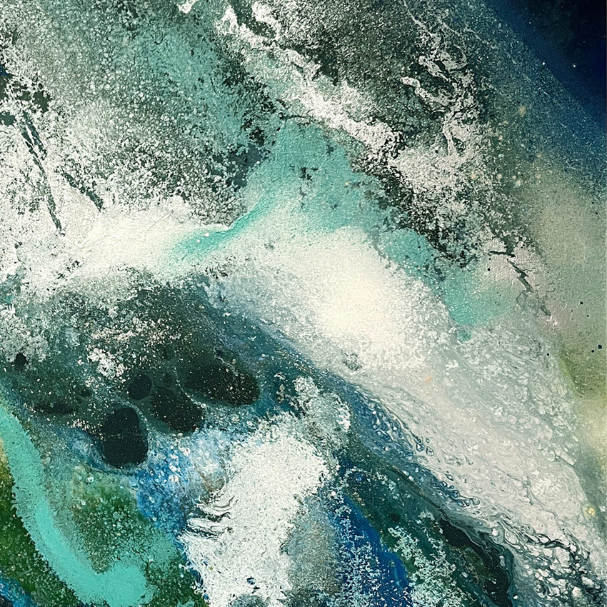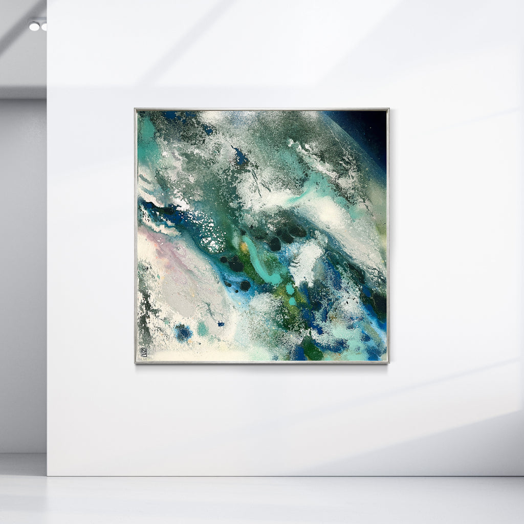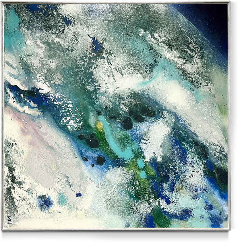 Overall framed dimensions: 103 x 103cms, 3.2cms in depth. The frame is an elegant antique gold 'floating' frame with a 5mm space between the canvas and frame edge. Canvas dimensions: 100cms x 100cms, 1.8cms in depth. Stretched 380g canvas. Signed and dated on the reverse.
