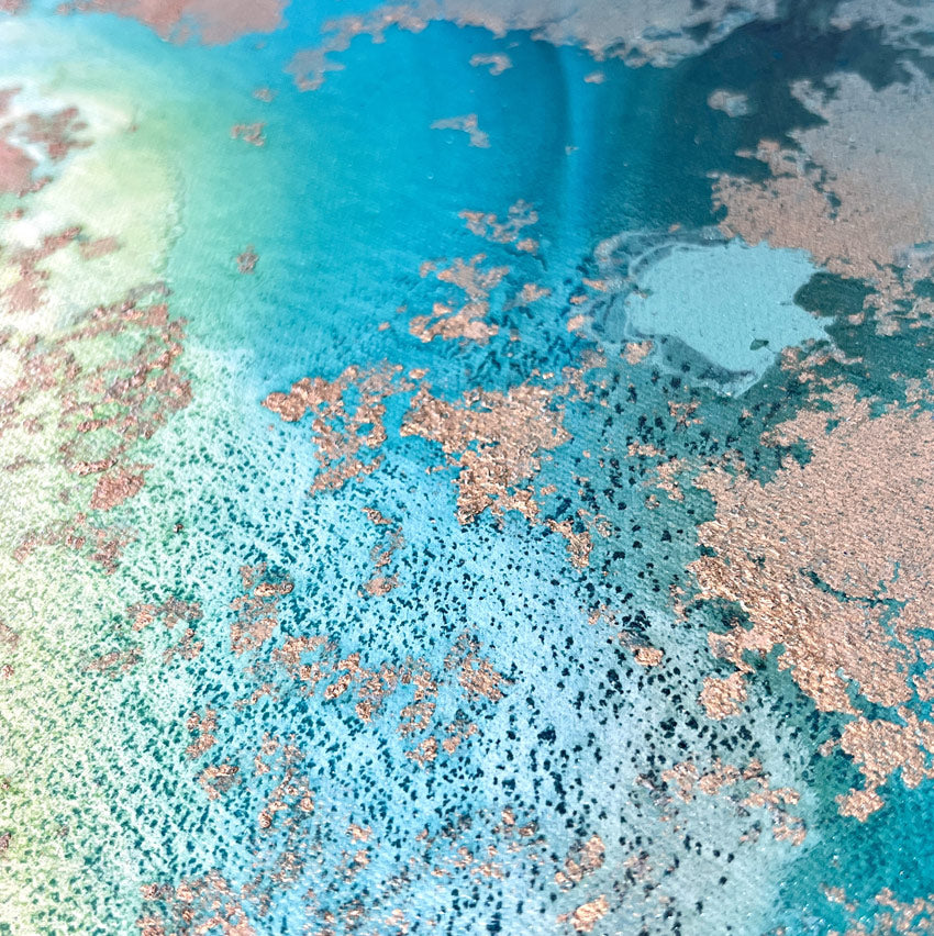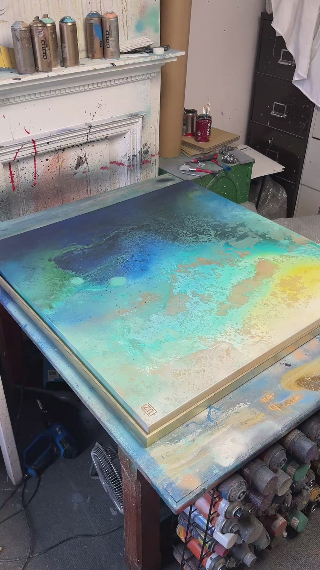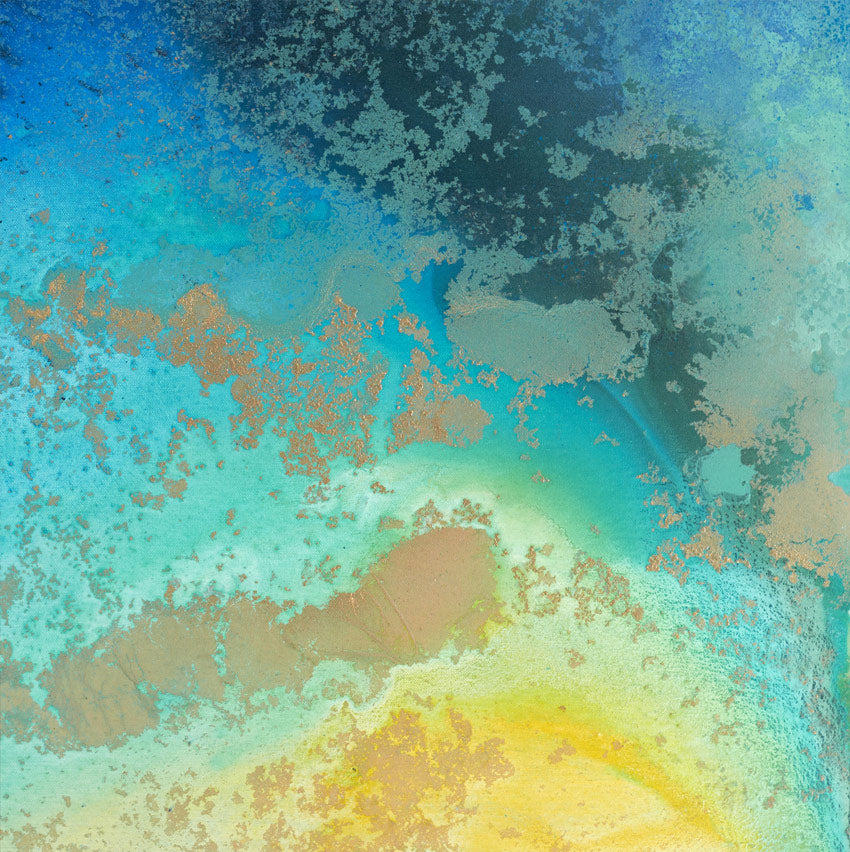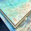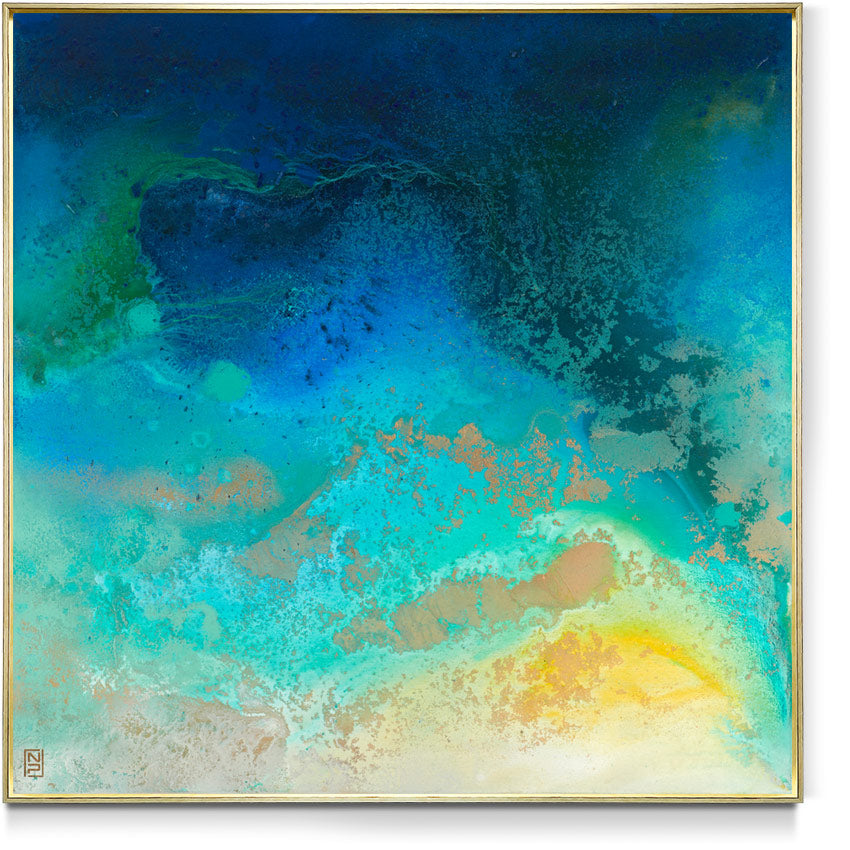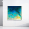 Overall framed dimensions: 103 x 103cms, 3.2cms in depth. The frame is an elegant antique gold 'floating' frame with a 5mm space between the canvas and frame edge. Canvas dimensions: 100cms x 100cms, 1.8cms in depth. Stretched 380g canvas. Signed and dated on the reverse.