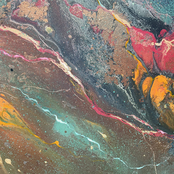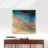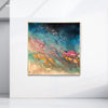 Overall framed dimensions: 103 x 103cms, 3.2cms in depth. The frame is an elegant antique gold 'floating' frame with a 5mm space between the canvas and frame edge. Canvas dimensions: 100cms x 100cms, 1.8cms in depth. Stretched 380g canvas. Signed and dated on the reverse.
